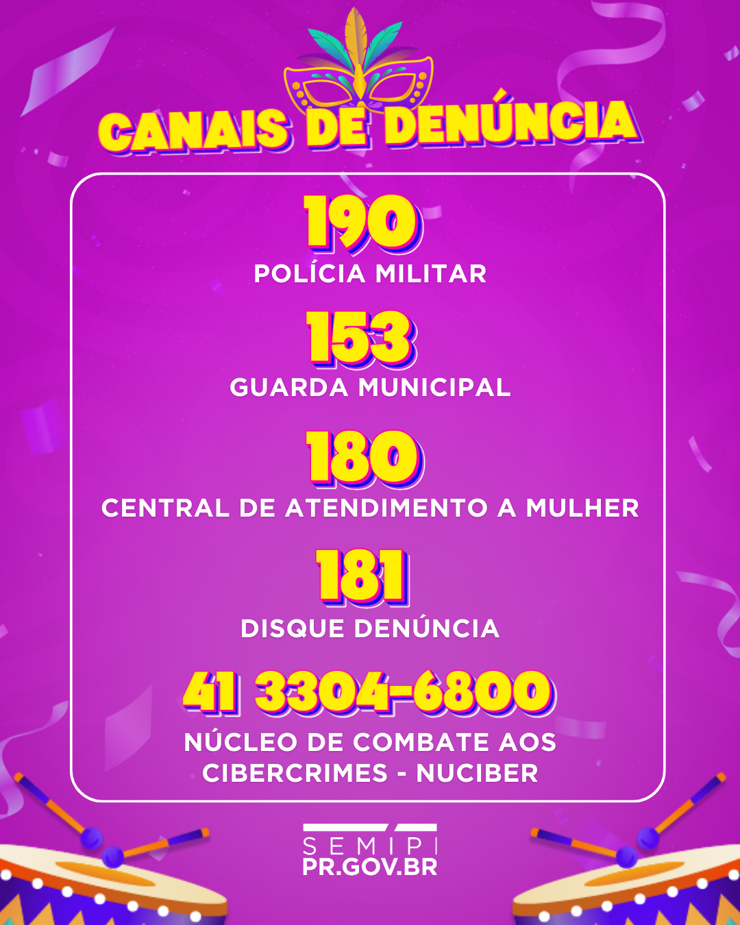 O Governo do Estado, por meio da Secretaria da Mulher, Igualdade Racial e Pessoa Idosa (SEMIPI), lançou a Campanha de Carnaval 2026 com o tema “Não é Não: No Bloco e Nas Redes!”. O nosso município confirmou adesão a esta iniciativa, que visa prevenir casos de importunação sexual e reforçar a importância do respeito ao consentimento.